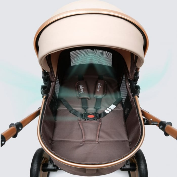 Accesoriile incluse, precum husa pentru picioare, salteaua moale si cosul spatios, il transforma intr-o solutie practica si eleganta pentru parinti
